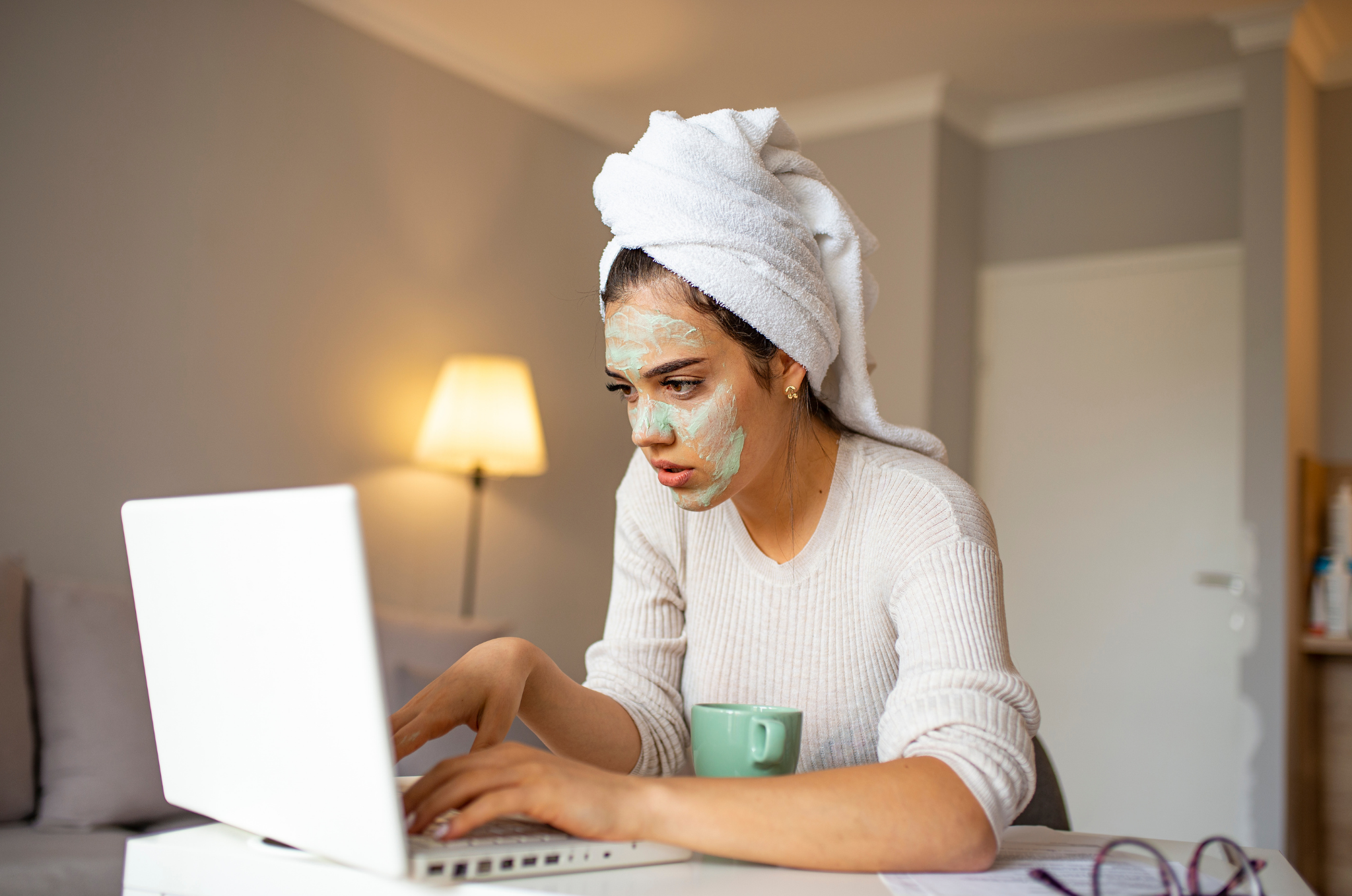 A realidade da blogueira é: lava o cabelo, coloca a mascara de hidratação no rosto e já está na tela do computador, como na foto, criando conteúdos.