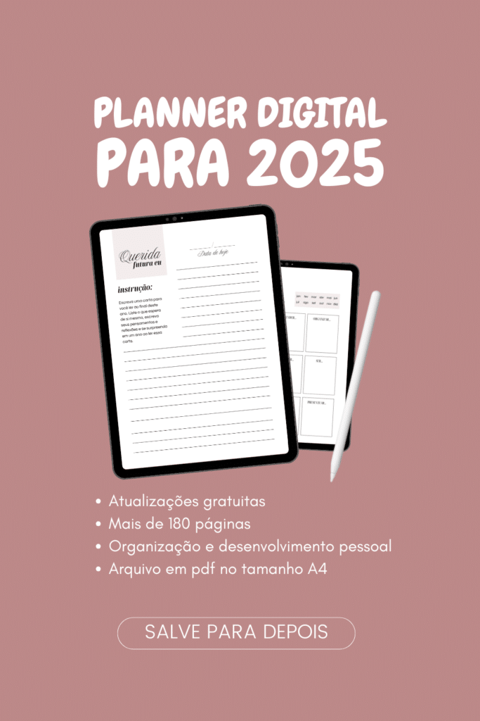 2025 está logo ali e mal dá para acreditar que isso é verdade. Parece que foi ontem as comemorações de natal e ano novo, muito menos parece que a lista de metas que estabeleci para esse ano já está com prazo de validade acirrado. Para quem ainda não caiu a ficha, é oficial, dois mil e vinte cinco está chegando e com isso, tenho certeza que assim como eu, se está nesse post, quer se organizar ainda mais para ter um ano incrível. Por isso, no post de hoje quero apresentar a vocês o Planner digital que vou utilizar nesse próximo ano.